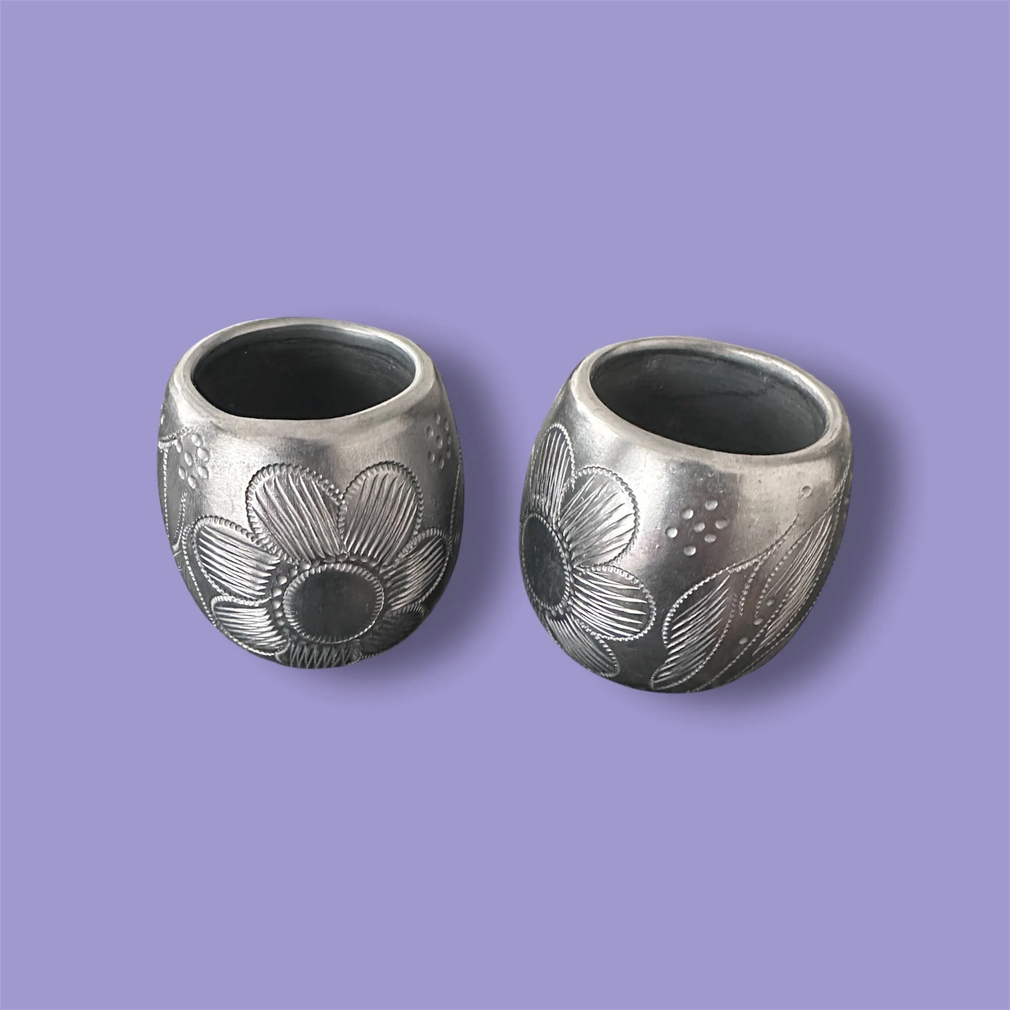 Perfect for mezcal, tequila, or even espresso, these shot glasses come as a pair. These pieces were handcrafted by Elizabeth in San Bartolo Coyotepec, Oaxaca, using the region’s iconic Barro Negro (black clay). The distinctive sheen and character of this pottery reflect centuries of tradition and ancestral skill. Every creation carries both beauty and history — it’s no wonder ancient Zapotec folktales call barro negro the “pottery of the night”.